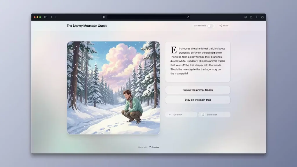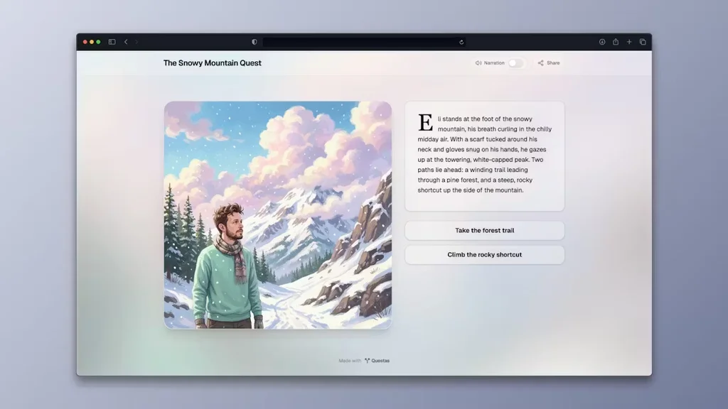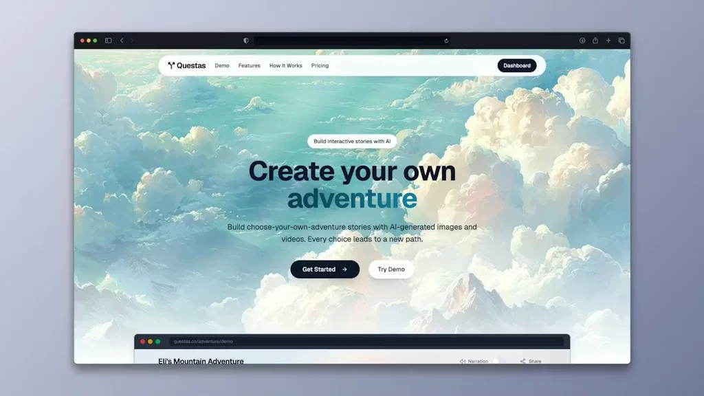 Questas lets you build choose-your-own-adventure stories with AI-generated images and videos. Start with a character and a simple concept, and Questas turns it into a branching story you can edit, share, and play through like an interactive book.